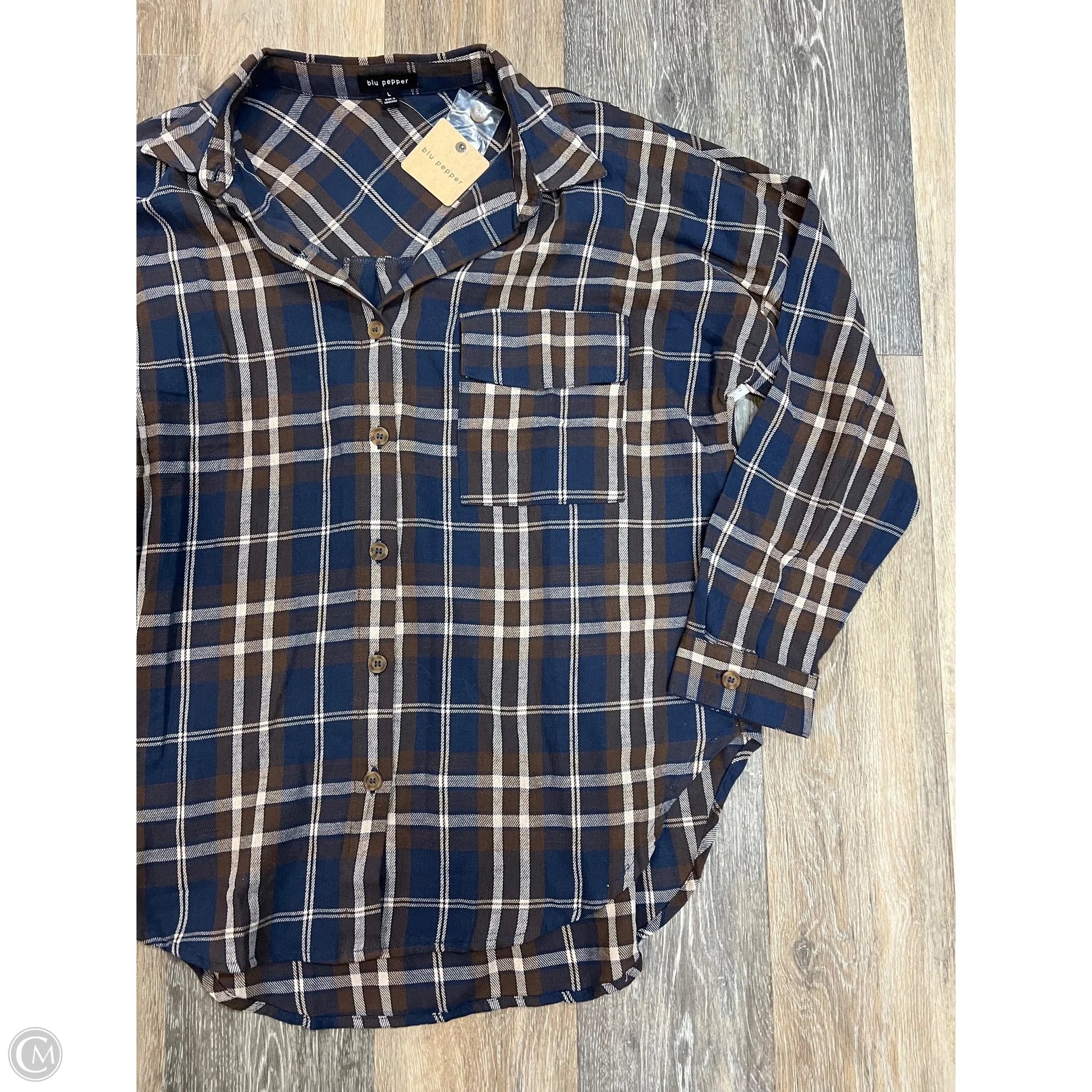 Blouse Long Sleeve By Blu Pepper In Plaid Pattern, Size: L
