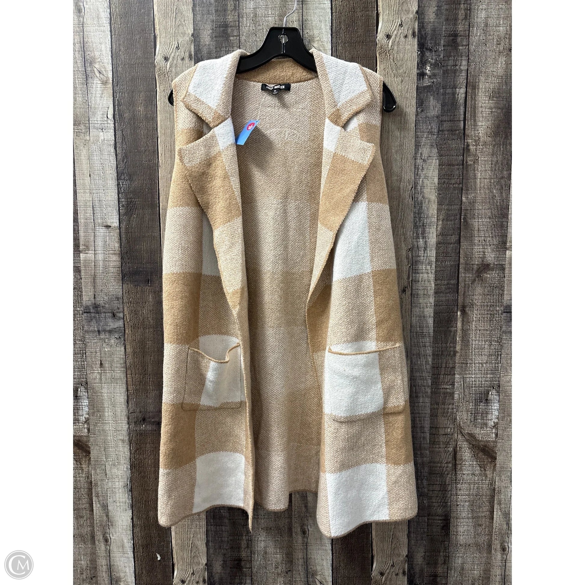 Indulge in cozy sophistication with the Steve Madden Tan & White Cardigan in size M. Luxurious fabric, timeless style.
