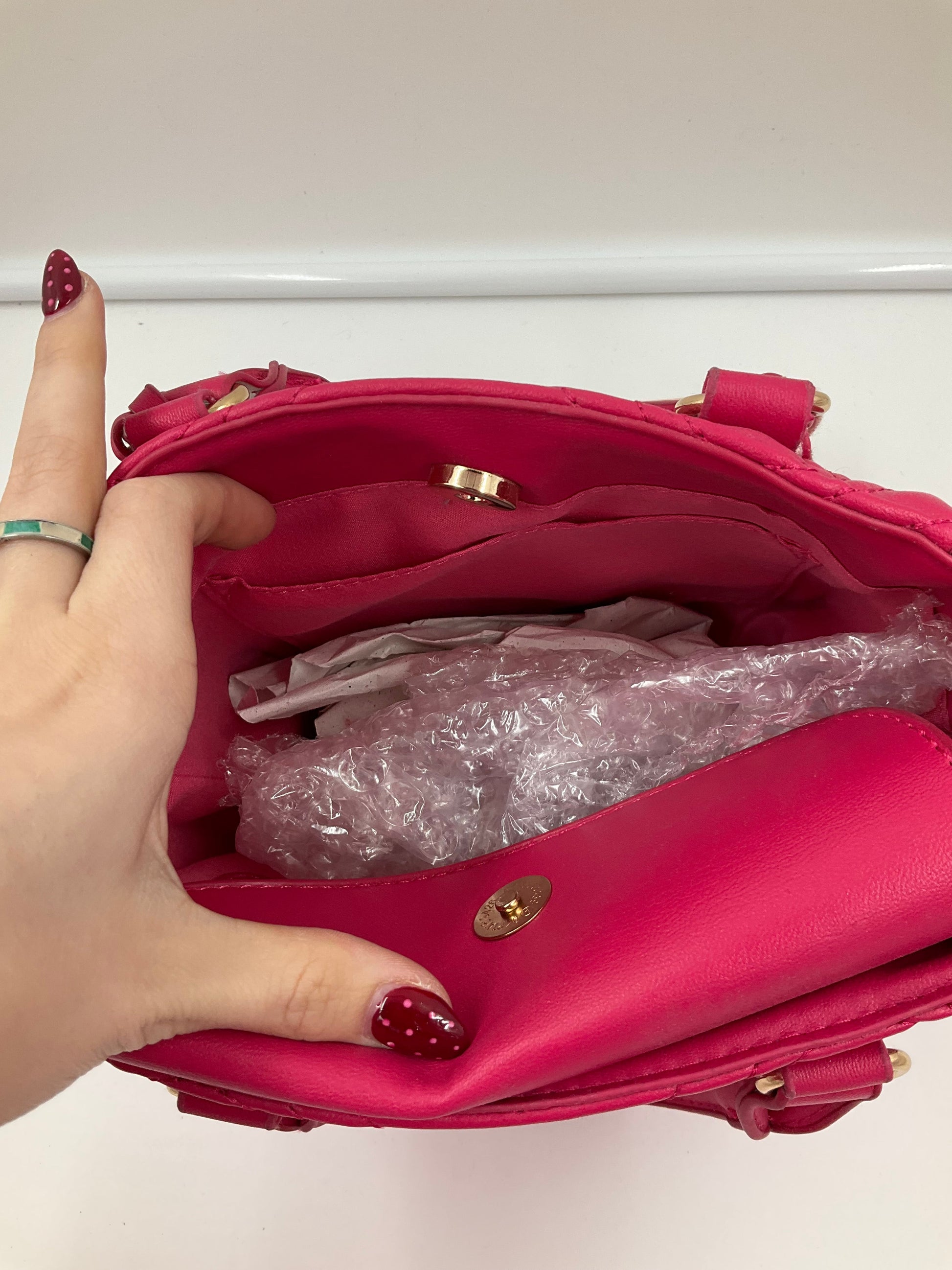 Indulge in the playful elegance of this Valentino-Mario pink crossbody. Compact yet striking, it adds a pop of personality to any ensemble with its chic design and vibrant hue.