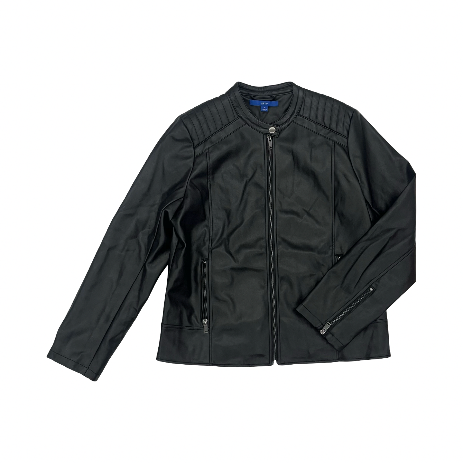 Discover the urban edge with the Apt 9 Black Moto Jacket in Size L. Rugged style meets sleek sophistication.