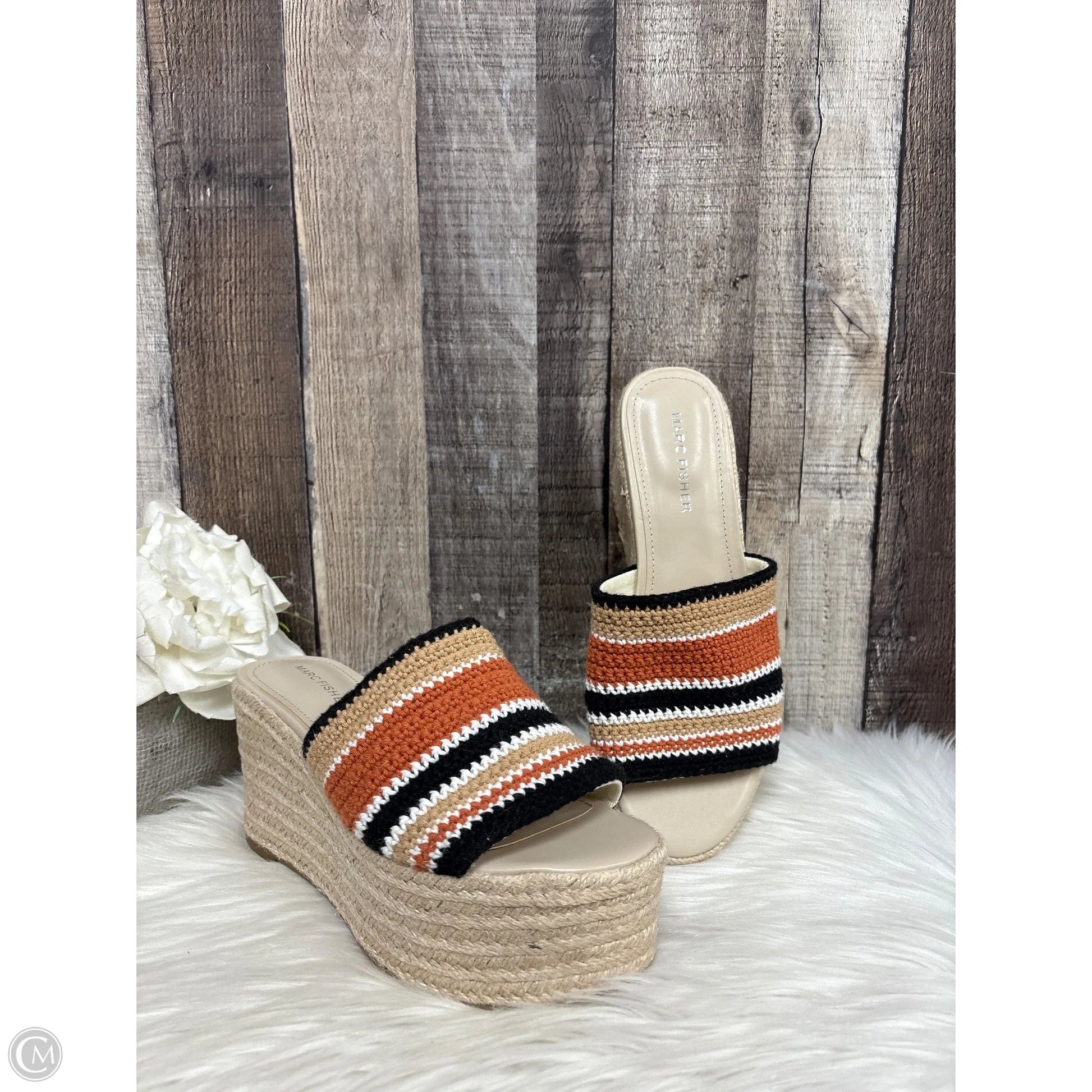 Step into effortless style with these Marc Fisher sandals in brown & cream. The perfect blend of comfort and chic, these wedges in size 8 are a must-have for any wardrobe.
